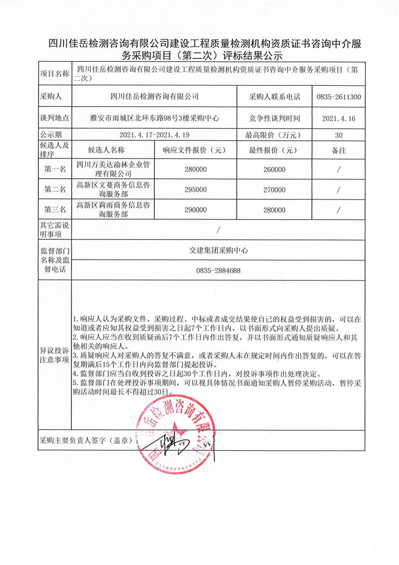 四川佳岳檢測咨詢有限公司建設工程質量檢測機構資質證書咨詢中介服務采購項目(第二次)評標結果公示