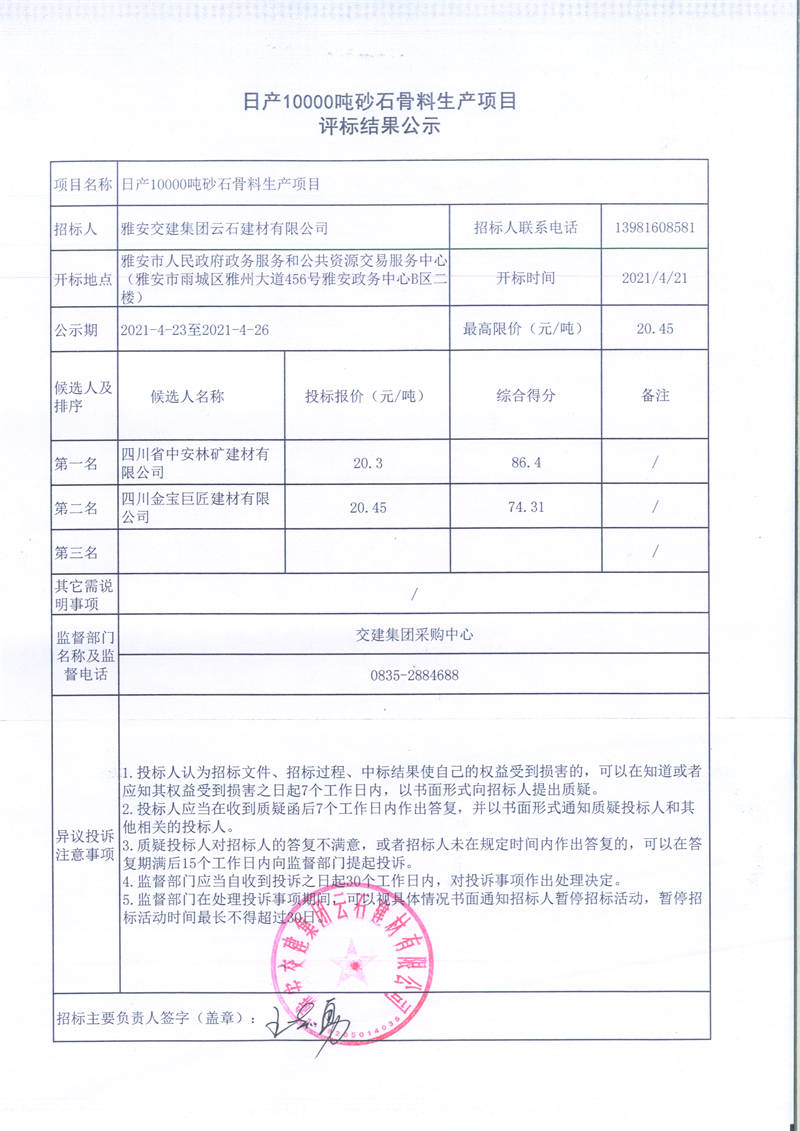 雅安交建集團云石建材有限公司日產10000噸砂石骨料生產項目評標結果公示