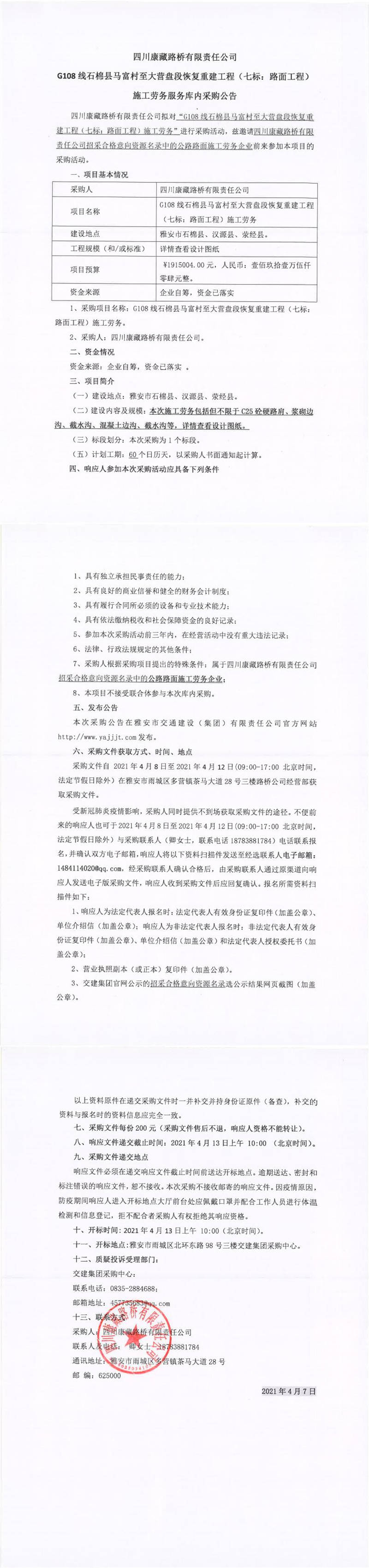 四川康藏路橋有限責任公司G108線石棉縣馬富村至大營盤段恢復重建工程(七標:路面工程)施工勞務(wù)服務(wù)庫內(nèi)采購公告