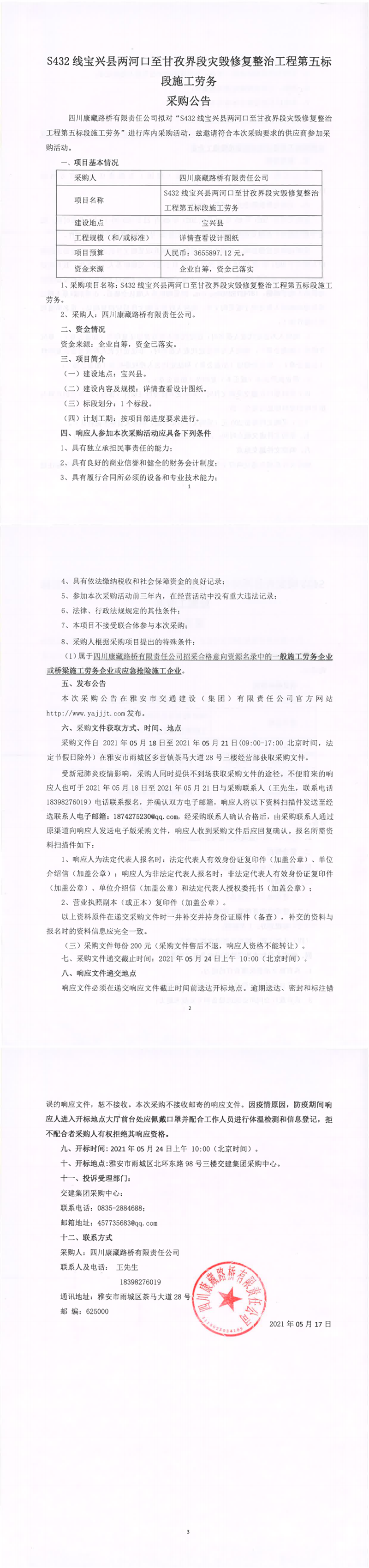 四川康藏路橋有限責(zé)任公司S432線(xiàn)寶興縣兩河口至甘孜界段災(zāi)毀修復(fù)整治工程第五標(biāo)段施工勞務(wù)采購(gòu)公告