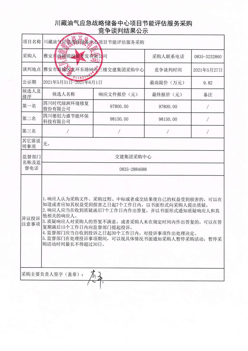 雅安川西能源投資開發(fā)有限公司川藏油氣應(yīng)急戰(zhàn)略儲(chǔ)備中心項(xiàng)目節(jié)能評估服務(wù)采購競爭談判結(jié)果公示