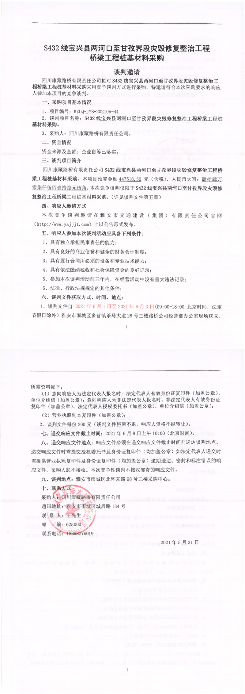 四川康藏路橋有限責(zé)任公司S432線寶興縣兩河口至甘孜界段災(zāi)毀修復(fù)整治工程橋梁樁基材料采購(gòu)競(jìng)爭(zhēng)談判公告