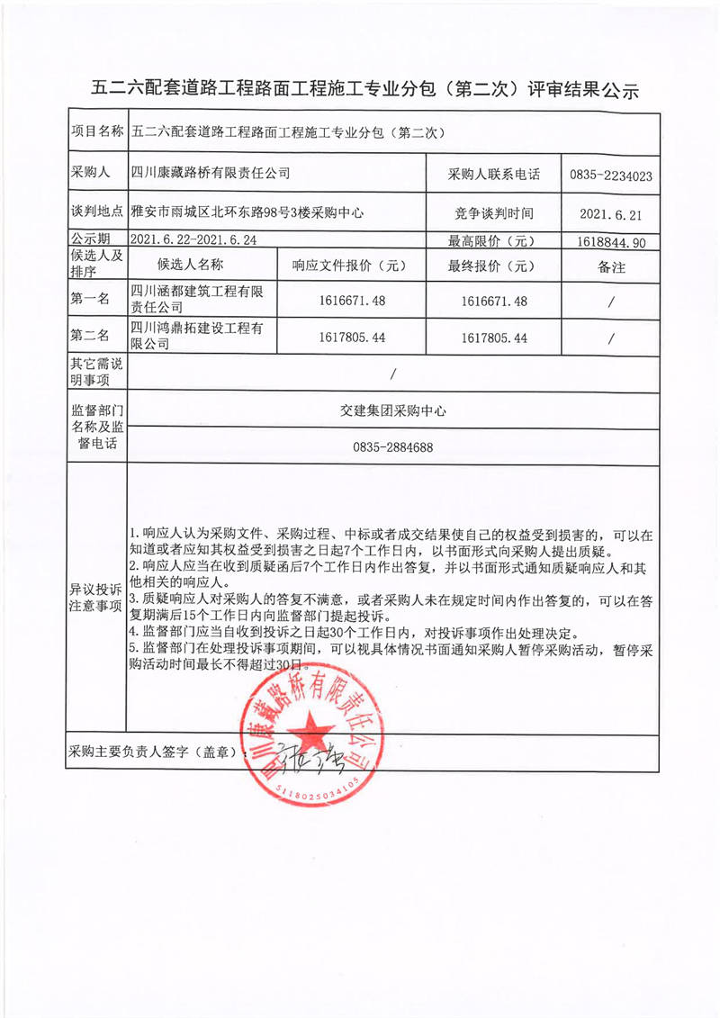 四川康藏路橋有限責任公司五二六配套道路工程路面工程施工專業(yè)分包(第二次)評審結果公示