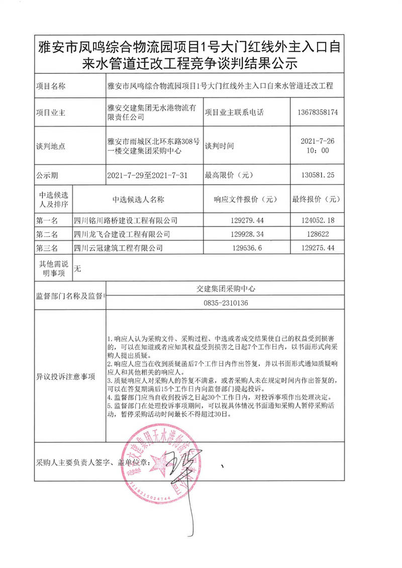雅安交建集團無水港物流有限責任公司雅安市鳳鳴綜合物流園項目1號大門紅線外主入口自來水管道遷改工程競爭談判結(jié)果公示