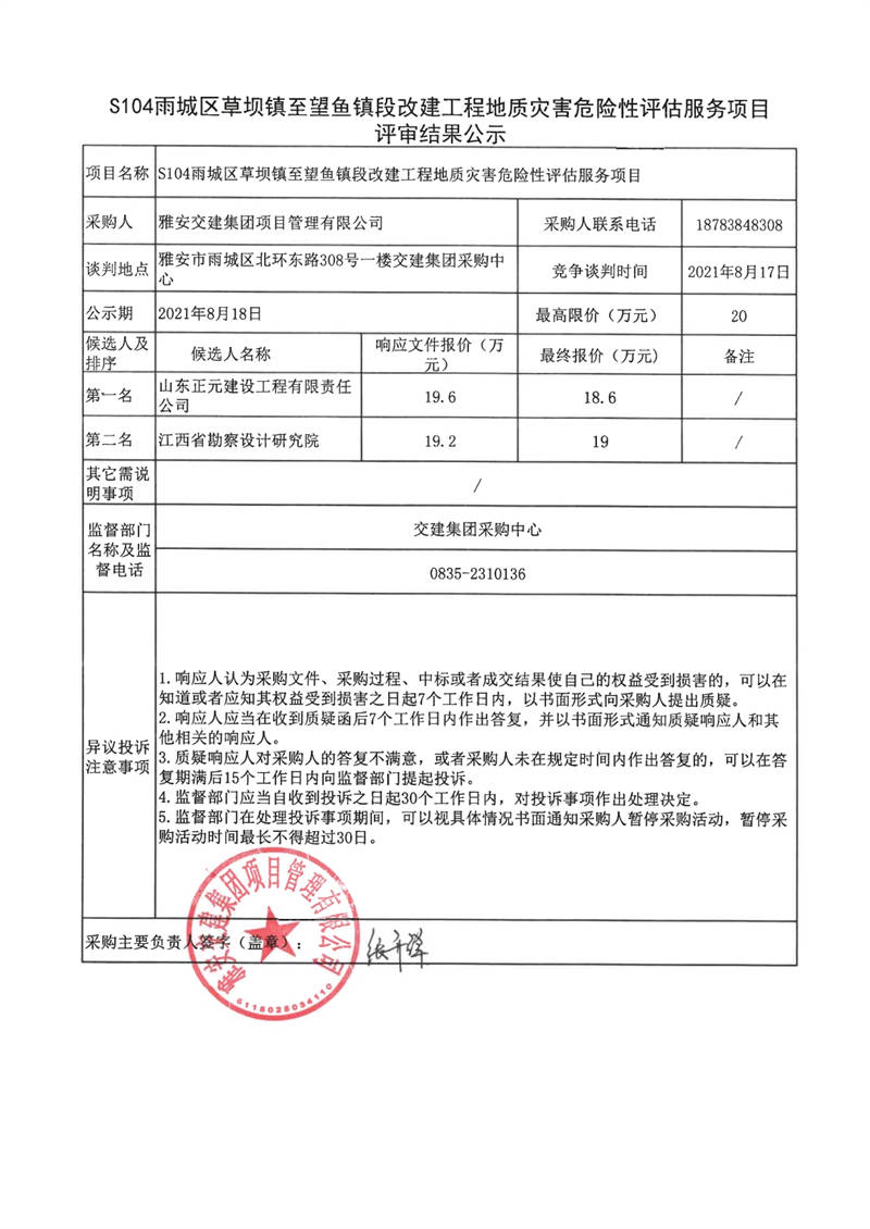 雅安交建集團(tuán)項(xiàng)目管理有限公司S104雨城區(qū)草壩鎮(zhèn)至望魚(yú)鎮(zhèn)改建工程地質(zhì)災(zāi)害危險(xiǎn)性評(píng)估服務(wù)項(xiàng)目評(píng)審結(jié)果公示