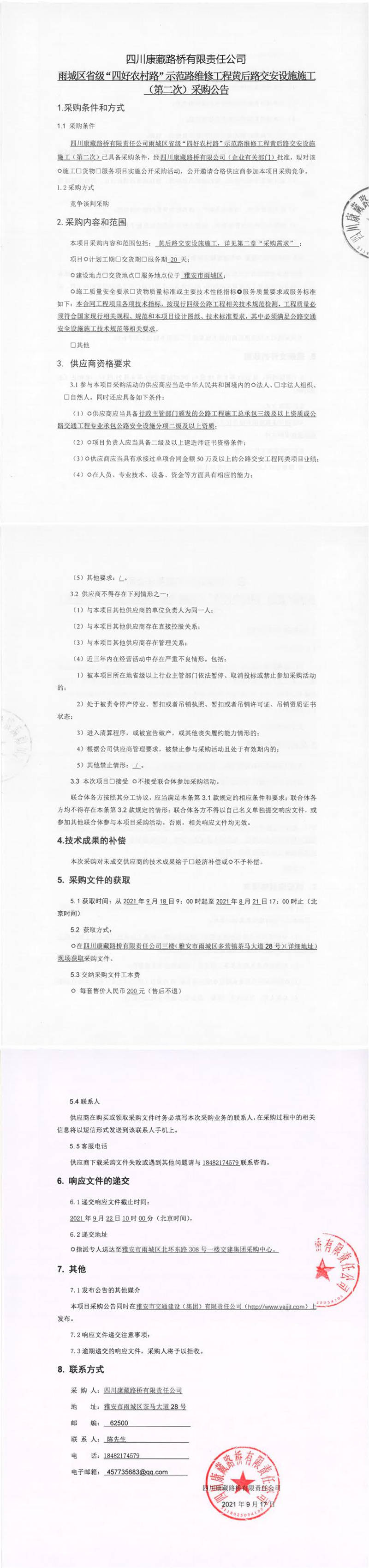 四川康藏路橋有限責(zé)任公司雨城區(qū)省級(jí)“四好農(nóng)村路”示范路維修工程黃后路交安設(shè)施施工(第二次)采購公告