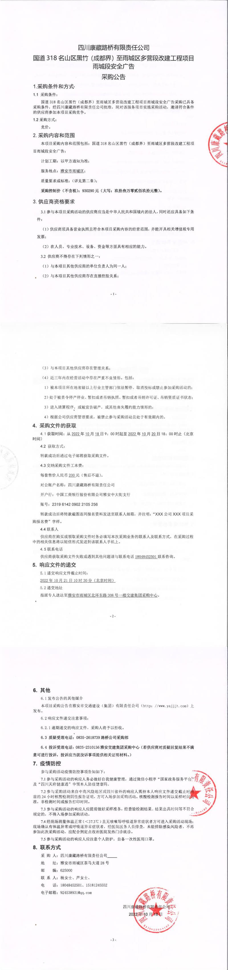 四川康藏路橋有限責任公司國道318名山區(qū)黑竹(成都界)至雨城區(qū)多營段改建工程雨城段安全廣告采購公告