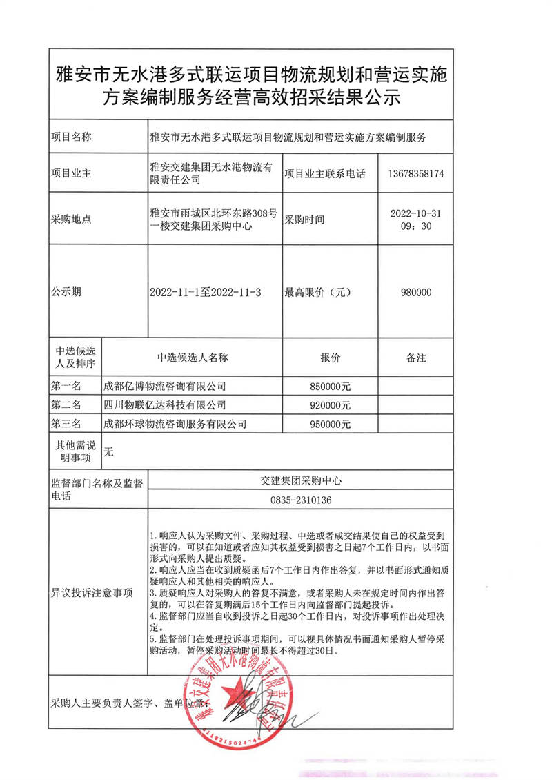 雅安交建集團(tuán)無水港物流有限責(zé)任公司雅安市無水港多式聯(lián)運(yùn)項目物流規(guī)劃和營運(yùn)實施方案編制服務(wù)經(jīng)營高效招采結(jié)果公示