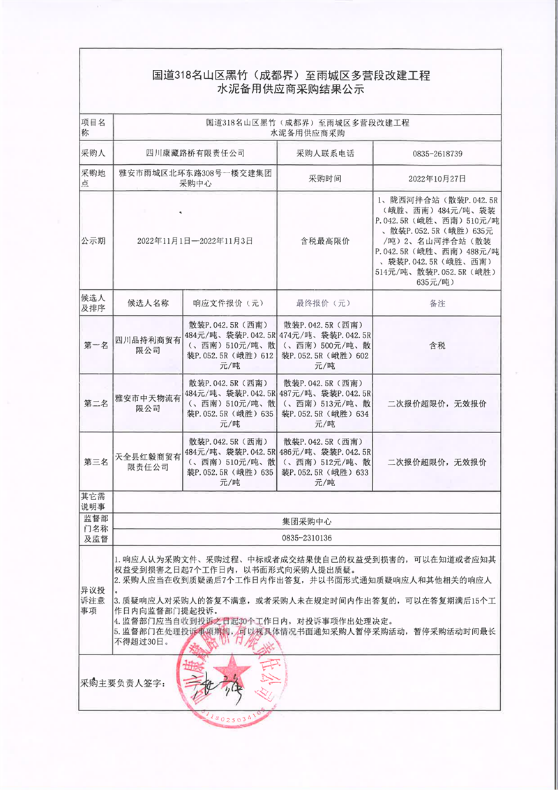 四川康藏路橋有限責(zé)任公司國(guó)道318名山區(qū)黑竹(成都界)至雨城區(qū)多營(yíng)段改建工程水泥備用供應(yīng)商采購結(jié)果公示