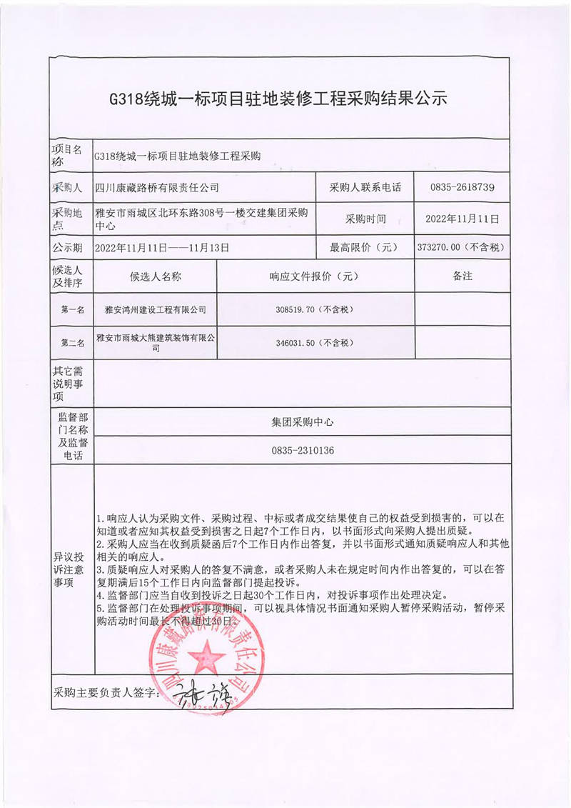 四川康藏路橋有限責任公司G318繞城一標項目駐地裝修工程采購結果公示
