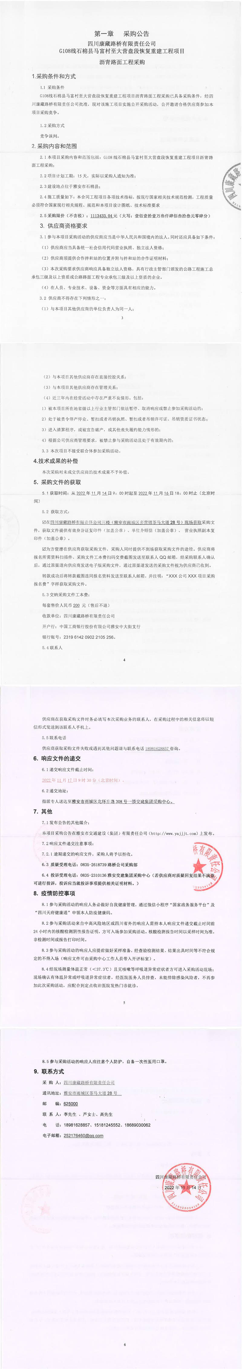 四川康藏路橋有限責(zé)任公司G108線石棉縣馬富村至大營盤段恢復(fù)重建工程項(xiàng)目瀝青路面工程采購公告