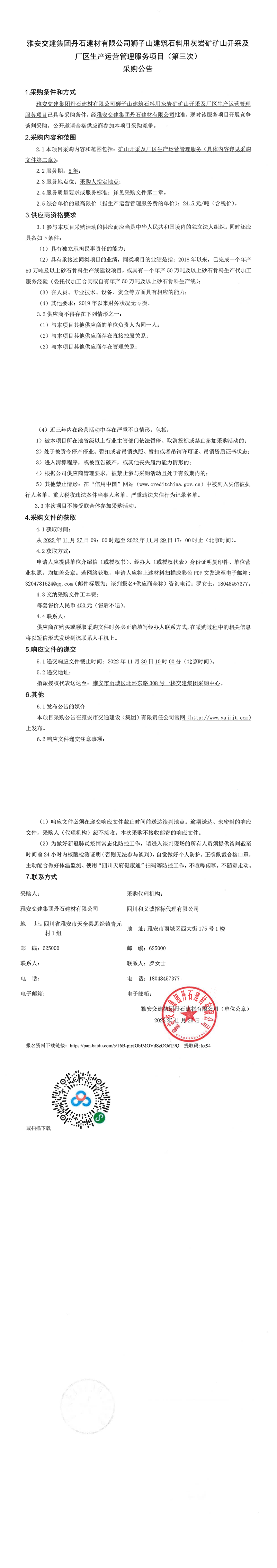 雅安交建集團丹石建材有限公司獅子山建筑石料用灰?guī)r礦礦山開采及廠區(qū)生產(chǎn)運營管理服務項目(第三次)采購公告