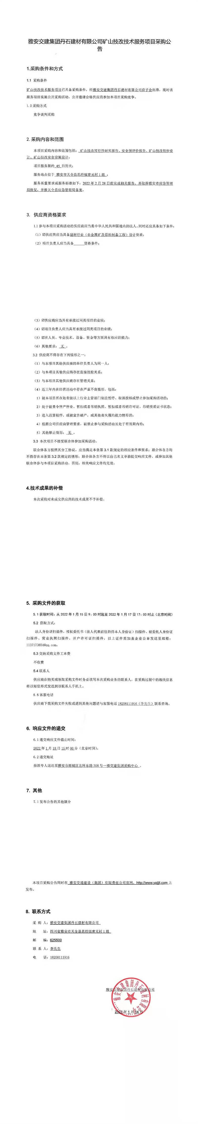 雅安交建集團丹石建材有限公司礦山技改技術(shù)服務(wù)項目采購公告