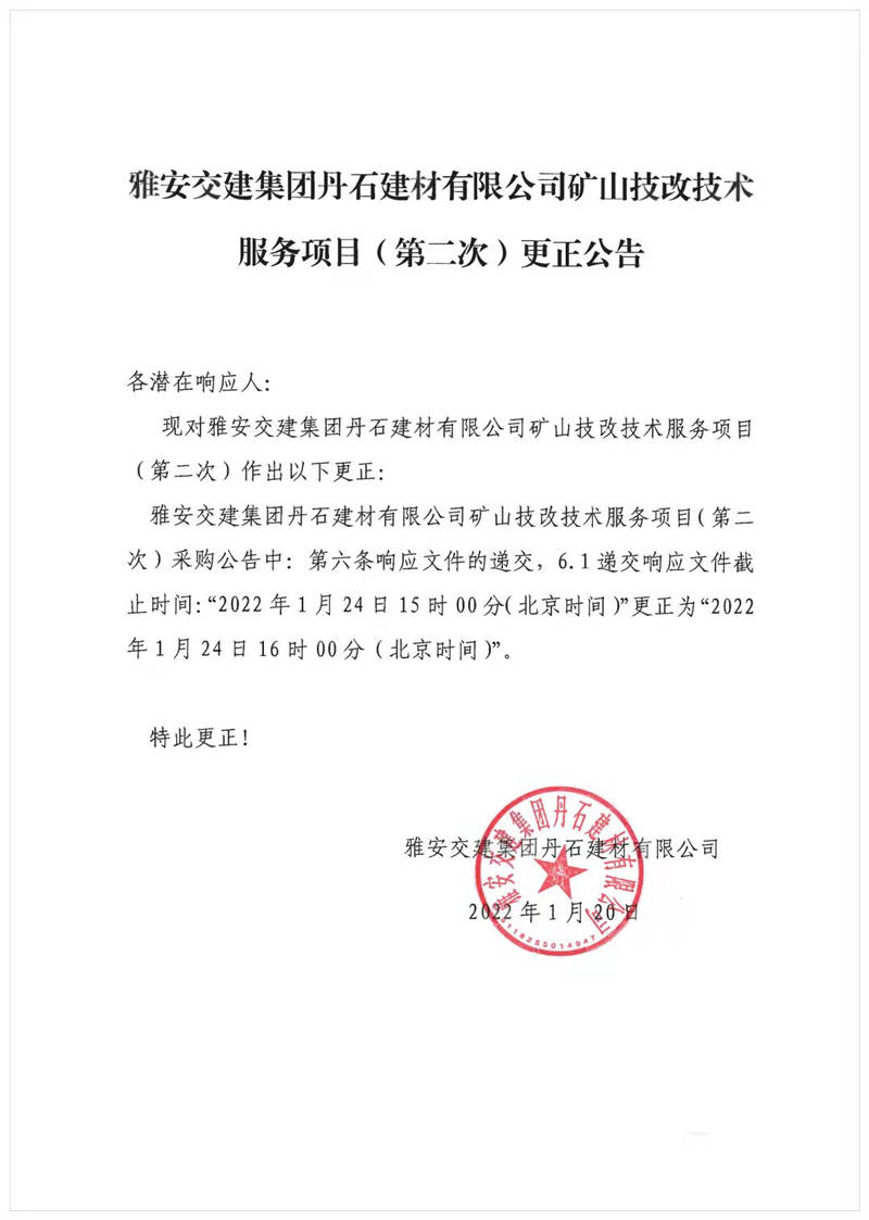 雅安交建集團(tuán)丹石建材有限公司礦山技改技術(shù)服務(wù)項目(第二次)更正公告