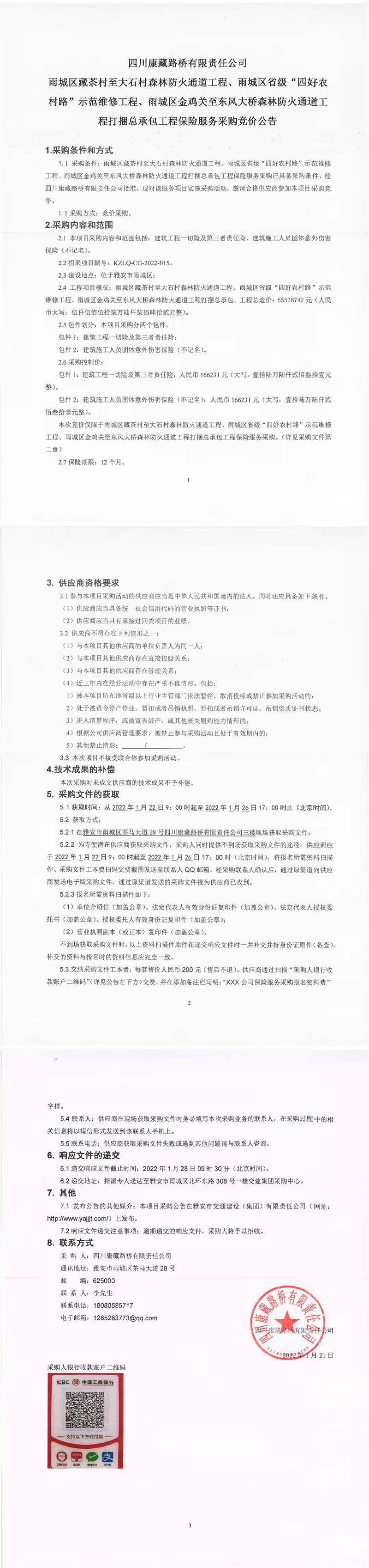 四川康藏路橋有限責任公司雨城區(qū)藏茶村至大石村森林防火通道工程、雨城區(qū)省級“四好農(nóng)村路”示范維修工程、雨城區(qū)金雞關(guān)至東風大橋森林防火通道工程打捆總承包工程保險服務(wù)采購競價公告