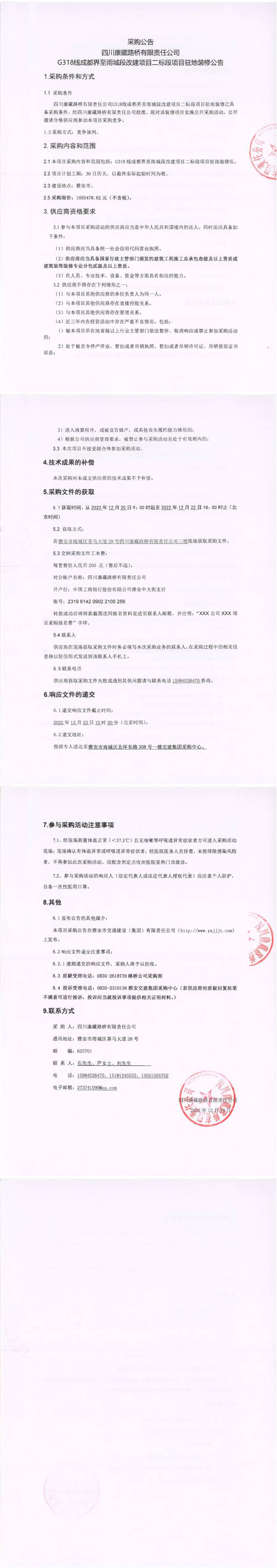四川康藏路橋有限責(zé)任公司G318線成都界至雨城段改建項目二標(biāo)段項目駐地裝修采購公告