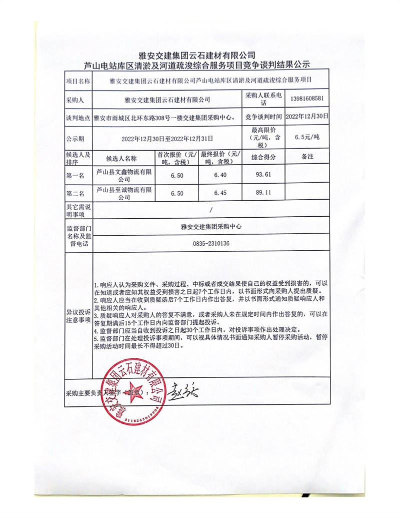 雅安交建集團云石建材有限公司蘆山電站庫區(qū)清淤及河道疏浚綜合服務項目競爭談判結果公示