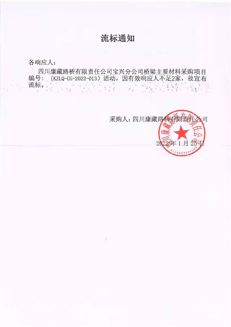 四川康藏路橋有限責任公司寶興分公司橋梁主要材料采購項目流標通知