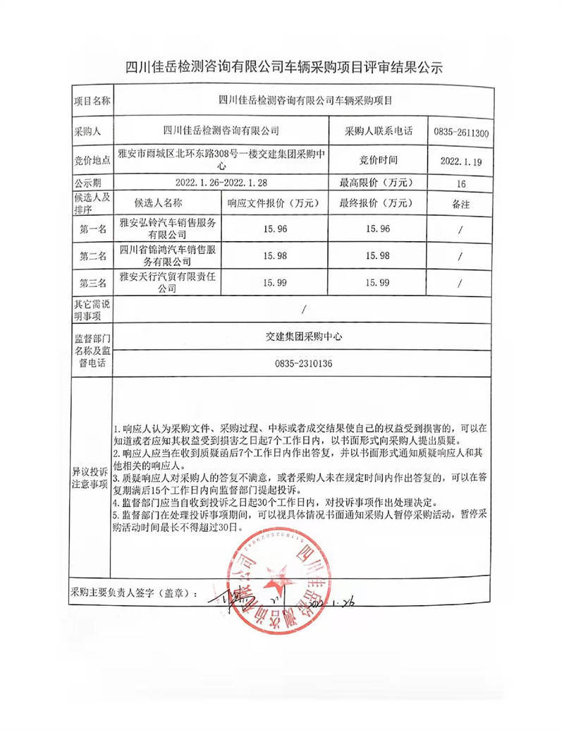 四川佳岳檢測咨詢有限公司車輛采購項(xiàng)目評審結(jié)果公示