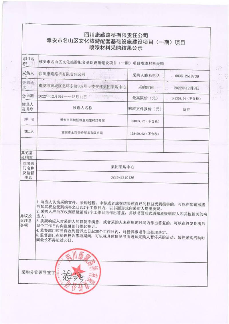 四川康藏路橋有限責任公司雅安市名山區(qū)文化旅游配套基礎設施建設項目(一期)項目噴漆材料采購結果公示