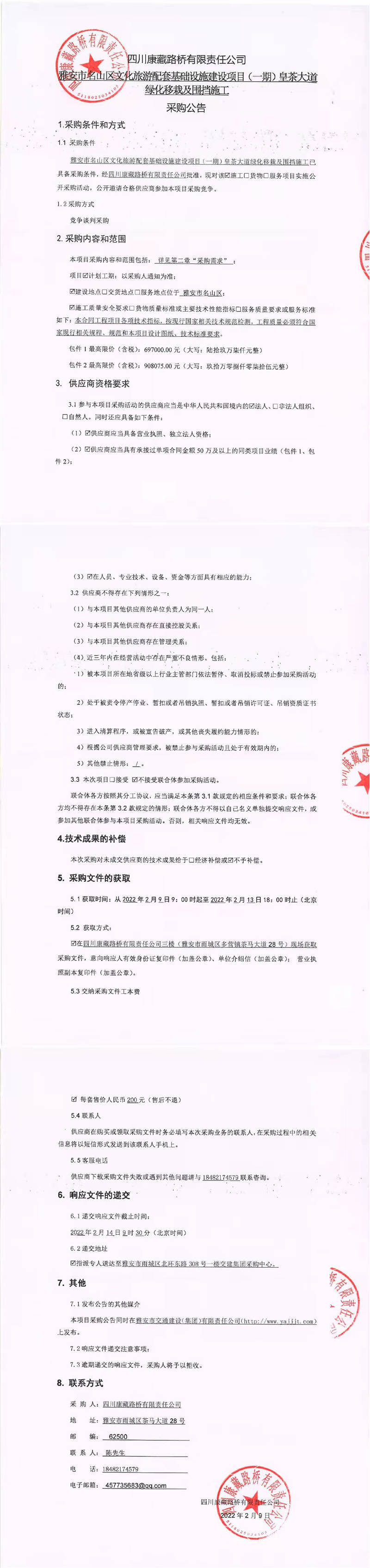 四川康藏路橋有限責(zé)任公司雅安市名山區(qū)文化旅游配套基礎(chǔ)設(shè)施建設(shè)項(xiàng)目(一期)皇茶大道綠化移栽及圍擋施工采購(gòu)公告