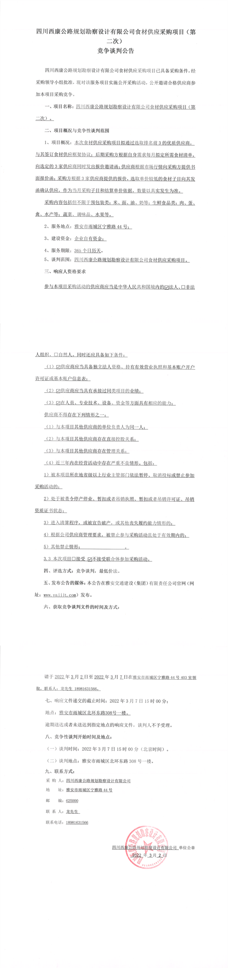 四川西康公路規(guī)劃勘察設(shè)計(jì)有限公司食材供應(yīng)采購(gòu)項(xiàng)目(第二次)競(jìng)爭(zhēng)談判公告