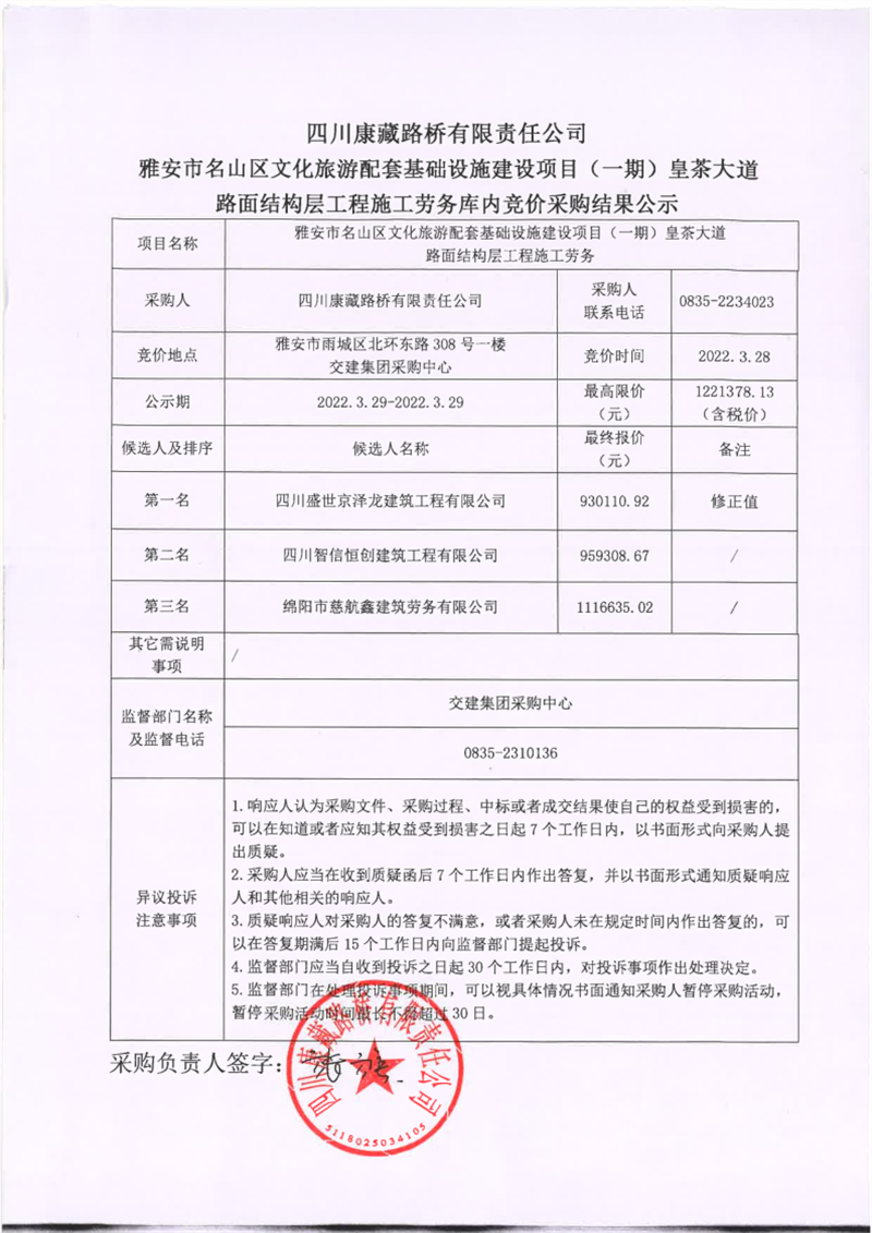 四川康藏路橋有限責(zé)任公司雅安市名山區(qū)文化旅游配套基礎(chǔ)設(shè)施建設(shè)項(xiàng)目(一期)路面結(jié)構(gòu)層工程施工勞務(wù)庫內(nèi)競價(jià)采購結(jié)果公示