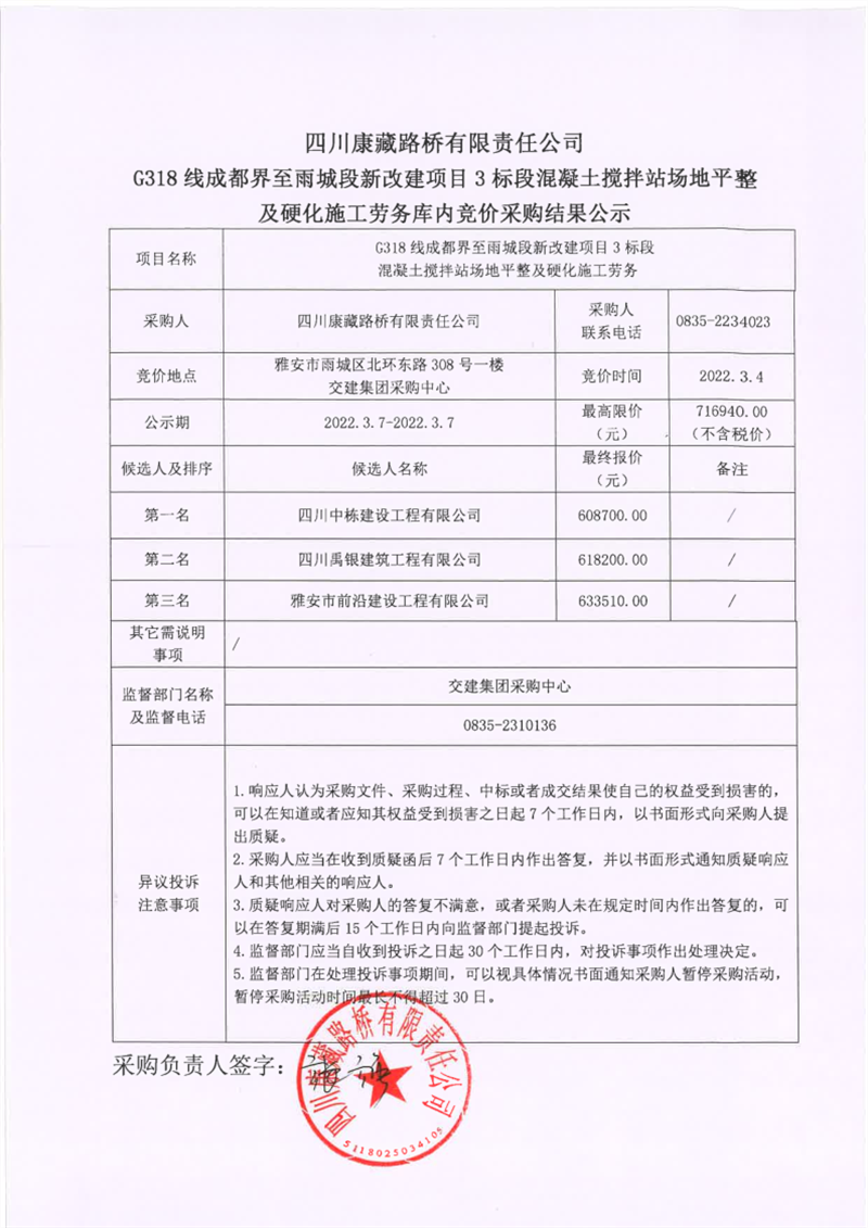 四川康藏路橋有限責任公司G318線成都界至雨城段新改建項目3標段混凝土攪拌站場地平整及硬化施工勞務庫內競價采購結果公示