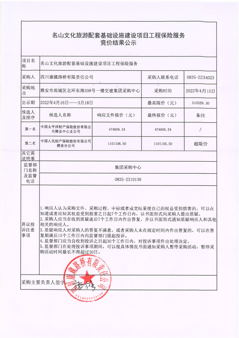 四川康藏路橋有限責(zé)任公司名山文化旅游配套基礎(chǔ)設(shè)施建設(shè)項目工程保險服務(wù)競價結(jié)果公示