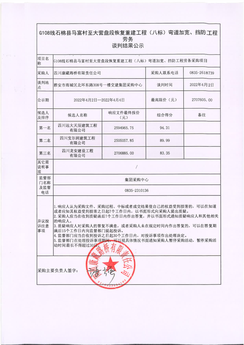 四川康藏路橋有限責任公司G108線石棉縣馬富村至大營盤段恢復重建工程(八標)彎道加寬、擋防工程勞務談判結果公示