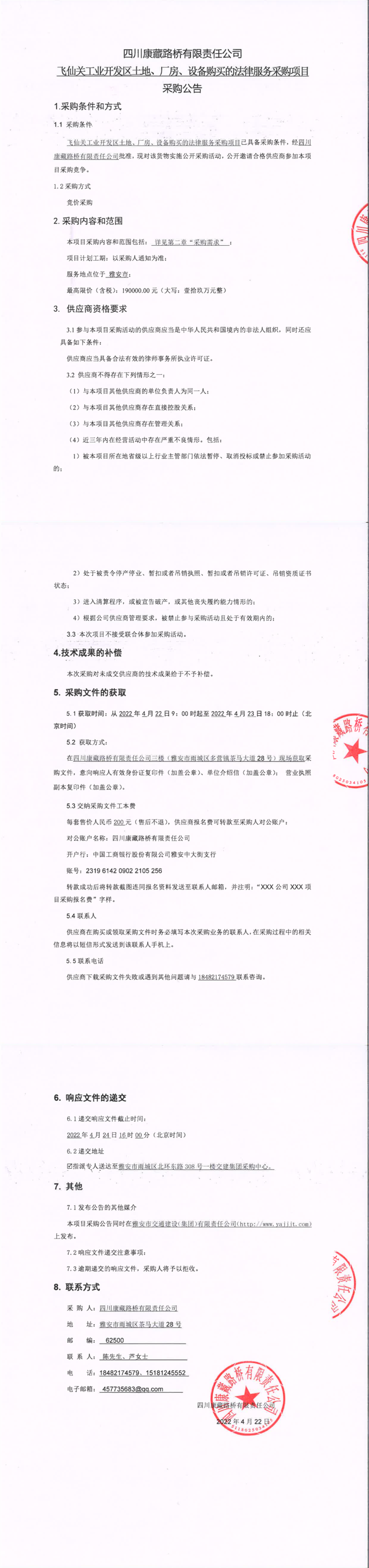 四川康藏路橋有限責任公司飛仙關(guān)工業(yè)開發(fā)區(qū)土地、廠房、設(shè)備購買的法律服務(wù)采購項目采購公告