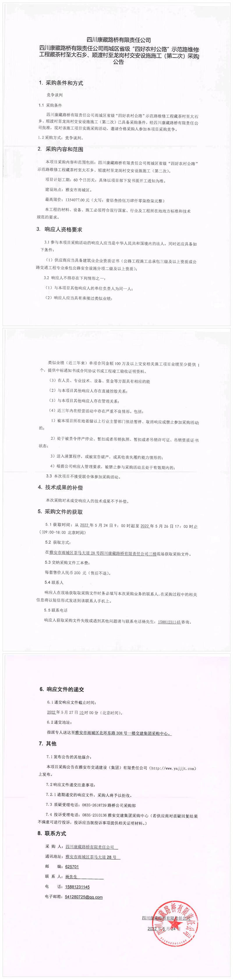 四川康藏路橋有限責任公司雨城區(qū)省級“四好農村公路”示范路維修工程藏茶村至大石鄉(xiāng)、順渡村至龍崗村交安設施施工(第二次)采購公告