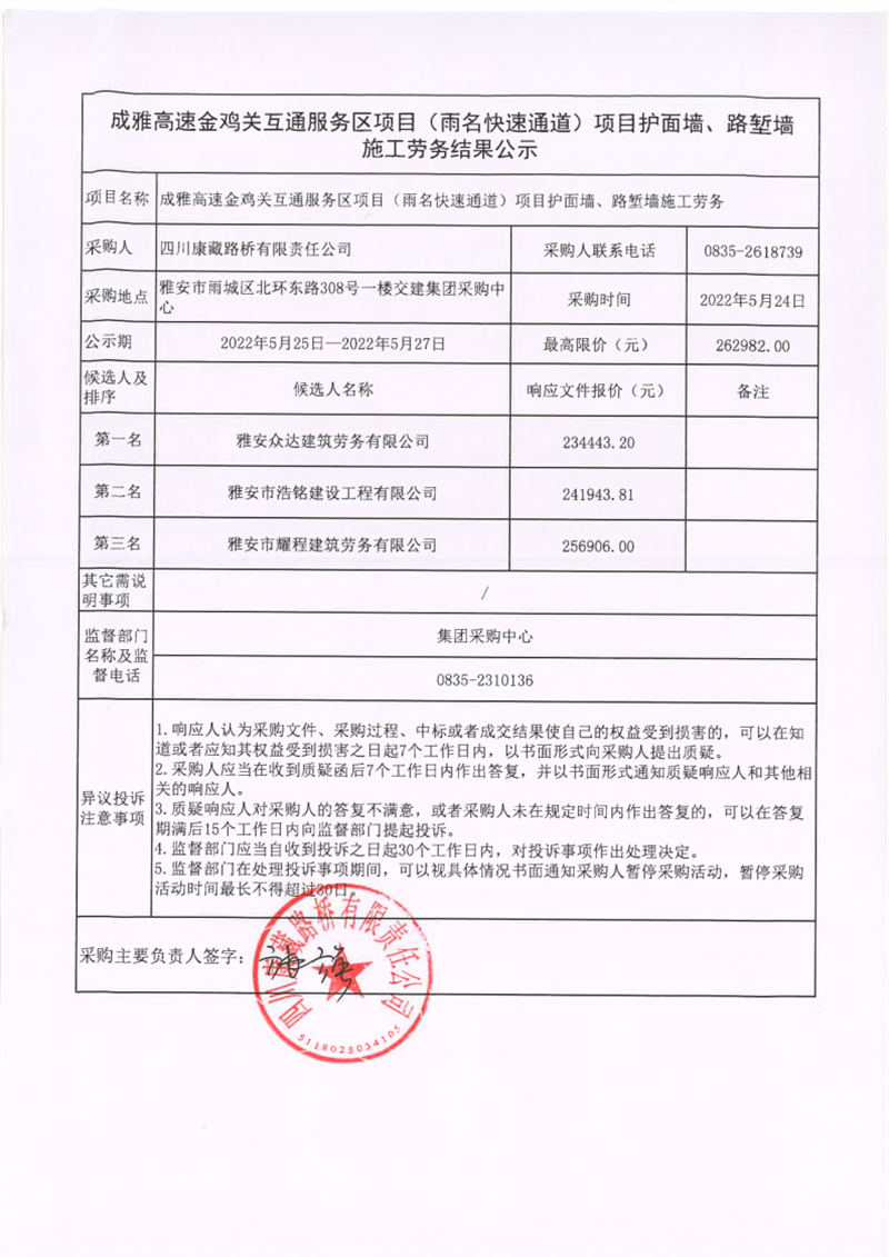四川康藏路橋有限責(zé)任公司成雅高速金雞關(guān)互通及服務(wù)區(qū)項目(雨名快速通道)項目護面墻、路塹墻施工勞務(wù)結(jié)果公示