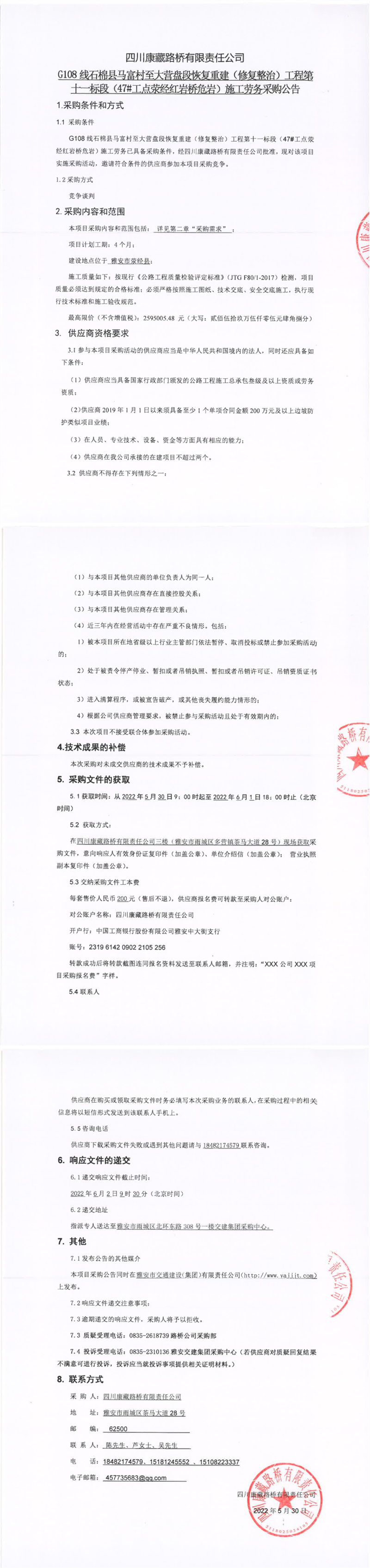 四川康藏路橋有限責任公司G108線石棉縣馬富村至大營盤段恢復重建(修復整治)工程第十一標段(47#工點滎經紅巖橋危巖)施工勞務采購公告