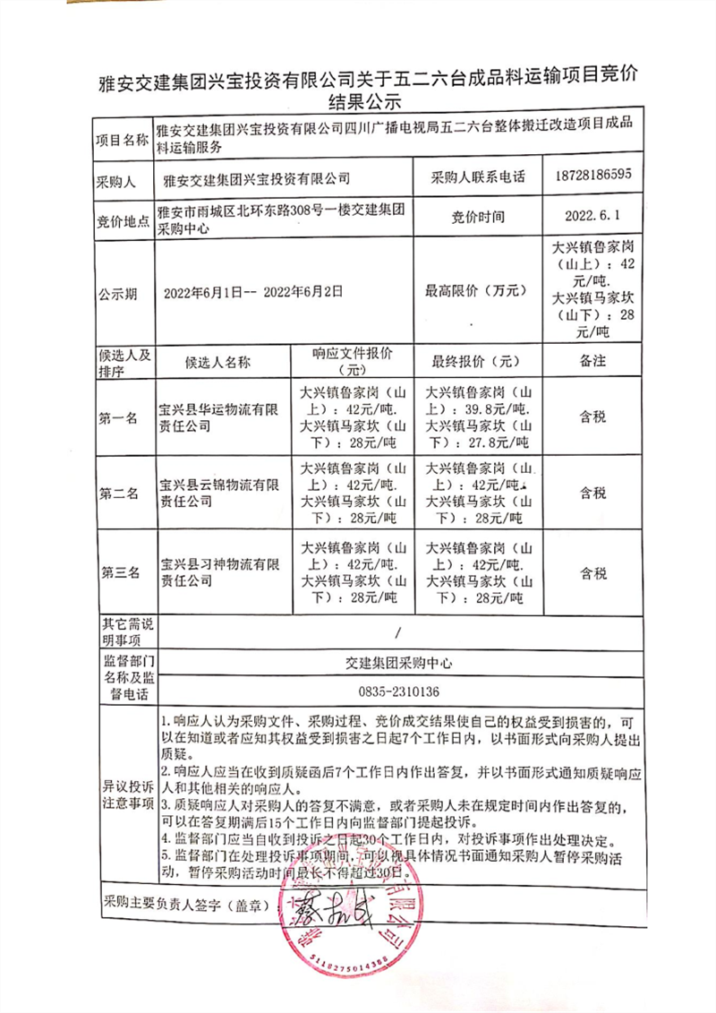 雅安交建集團(tuán)興寶投資有限公司關(guān)于五二六臺(tái)成品料運(yùn)輸項(xiàng)目競(jìng)價(jià)結(jié)果公示