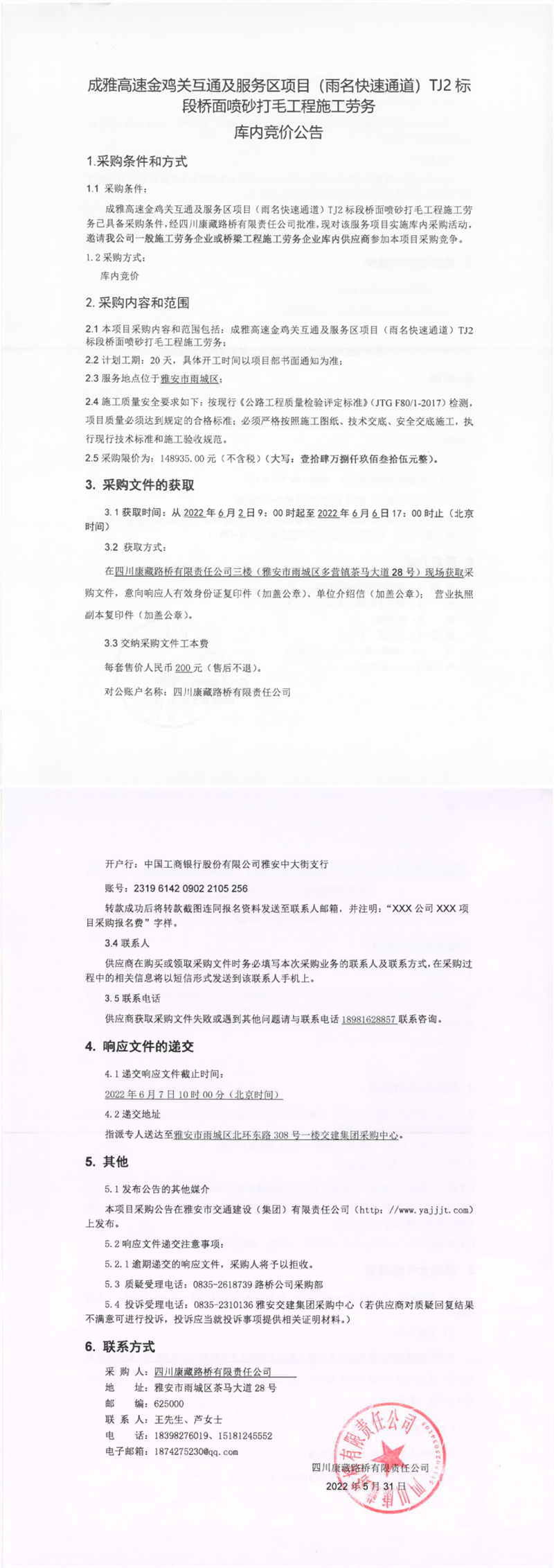 四川康藏路橋有限責任公司成雅高速金雞關互通及服務區(qū)項目(雨名快速通道)TJ2標段橋面噴砂打毛工程施工勞務庫內競價公告