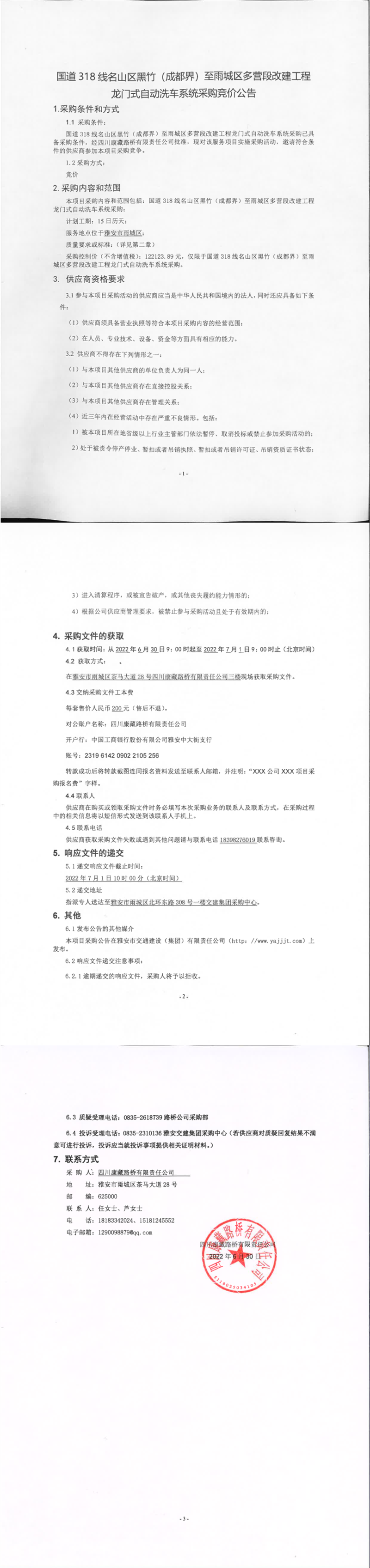 四川康藏路橋有限責(zé)任公司國(guó)道318名山區(qū)黑竹(成都界)至雨城區(qū)多營(yíng)段改建工程龍門式自動(dòng)洗車系統(tǒng)采購競(jìng)價(jià)公告