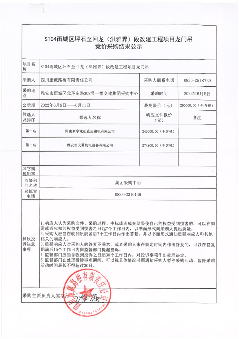 四川康藏路橋有限責(zé)任公司S104雨城區(qū)坪石至回龍(洪雅界)段改建工程項(xiàng)目龍門吊競價(jià)采購結(jié)果公示