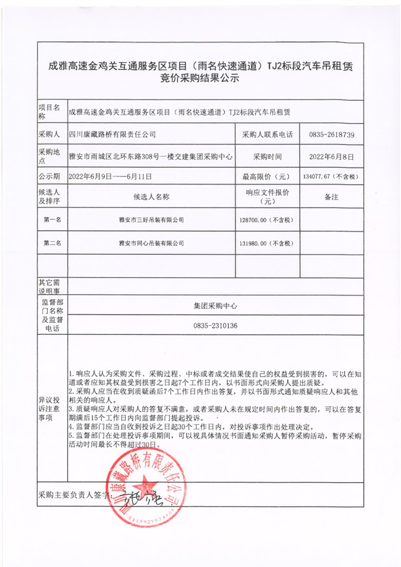 四川康藏路橋有限責(zé)任公司成雅高速金雞關(guān)互通服務(wù)區(qū)項(xiàng)目(雨名快速通道)TJ2標(biāo)段汽車吊租賃競價采購結(jié)果公示