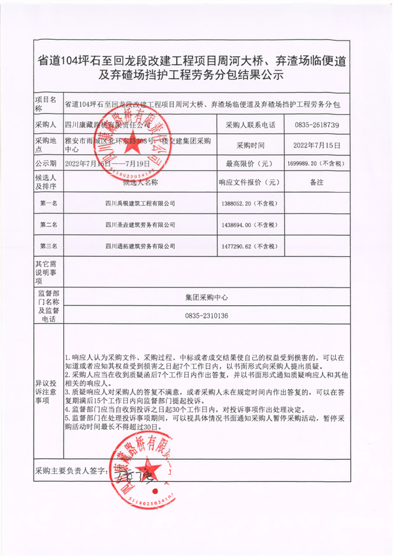 四川康藏路橋有限責任公司省道104坪石至回龍段改建工程項目周河大橋、棄渣場臨便道及棄碴場擋護工程勞務(wù)分包結(jié)果公示