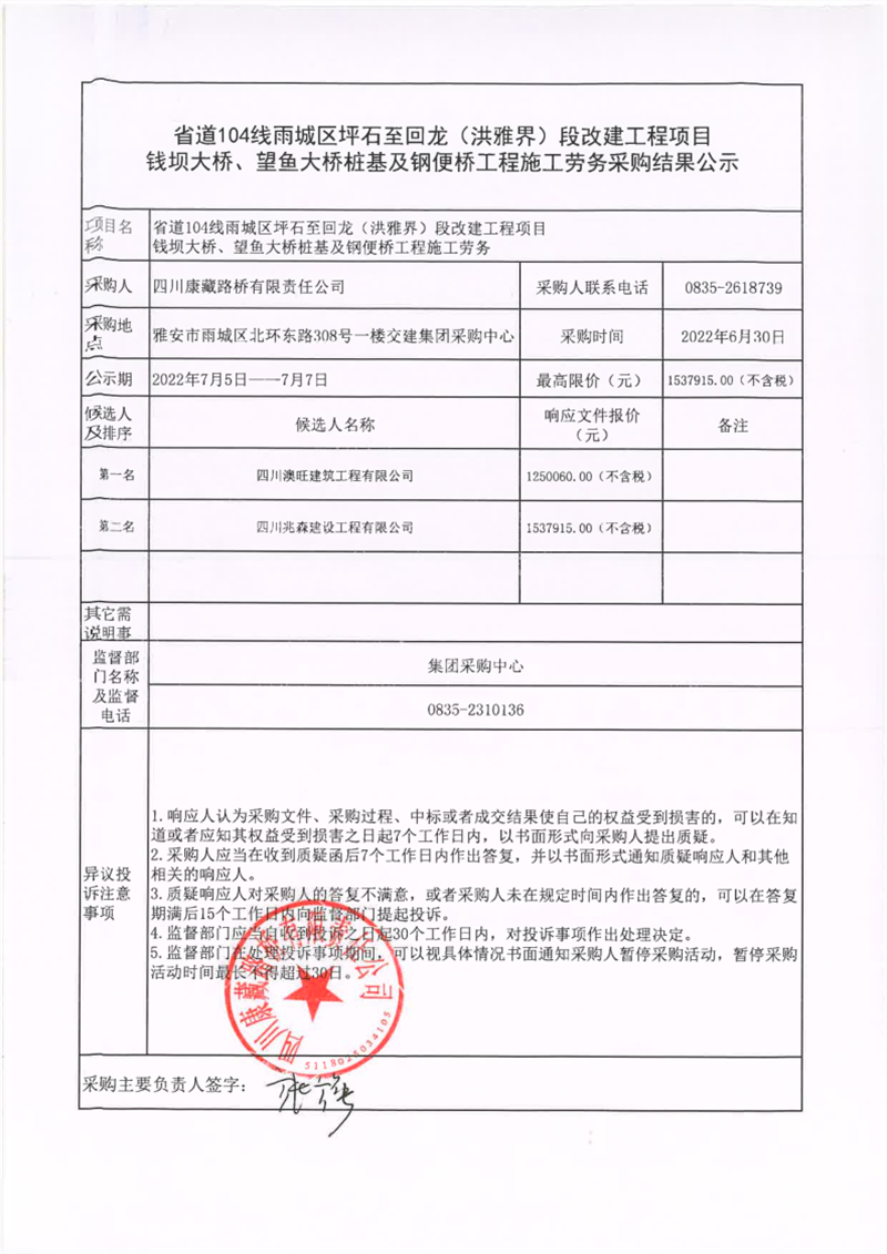 四川康藏路橋有限責任公司省道104線雨城區(qū)坪石至回龍(洪雅界)段改建工程項目錢壩大橋、望魚大橋樁基及鋼便橋工程施工勞務采購結果公示
