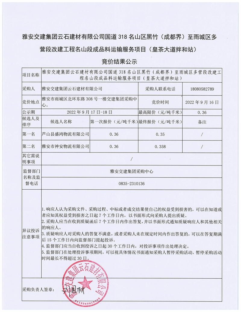 雅安交建集團(tuán)云石建材有限公司國道318名山區(qū)黑竹(成都界)至雨城區(qū)多營段改建工程雨城段成品料運(yùn)輸服務(wù)項目(皇茶大道拌和站)競價結(jié)果公示