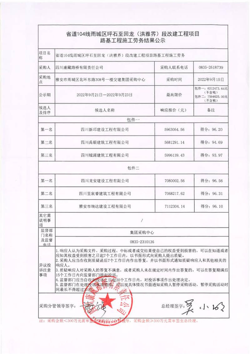 四川康藏路橋有限責(zé)任公司省道104線(xiàn)雨城區(qū)坪石至回龍(洪雅界)段改建工程項(xiàng)目路基工程施工勞務(wù)結(jié)果公示