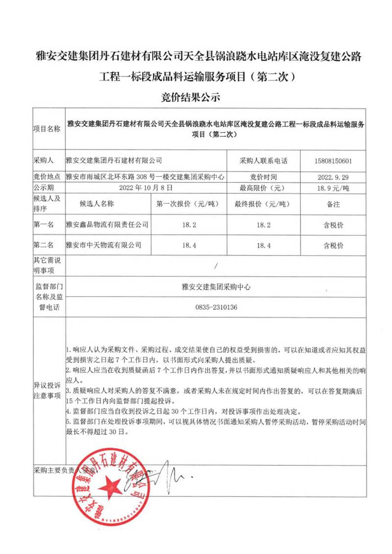 雅安交建集團(tuán)丹石建材有限公司天全縣鍋浪蹺水電站庫(kù)區(qū)淹沒復(fù)建公路工程一標(biāo)段成品料運(yùn)輸服務(wù)項(xiàng)目(第二次)競(jìng)價(jià)結(jié)果公示