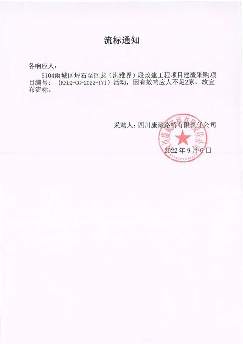 四川康藏路橋有限責任公司S104雨城區(qū)坪石至回龍(洪雅界)段改建工程項目建渣采購項目流標通知