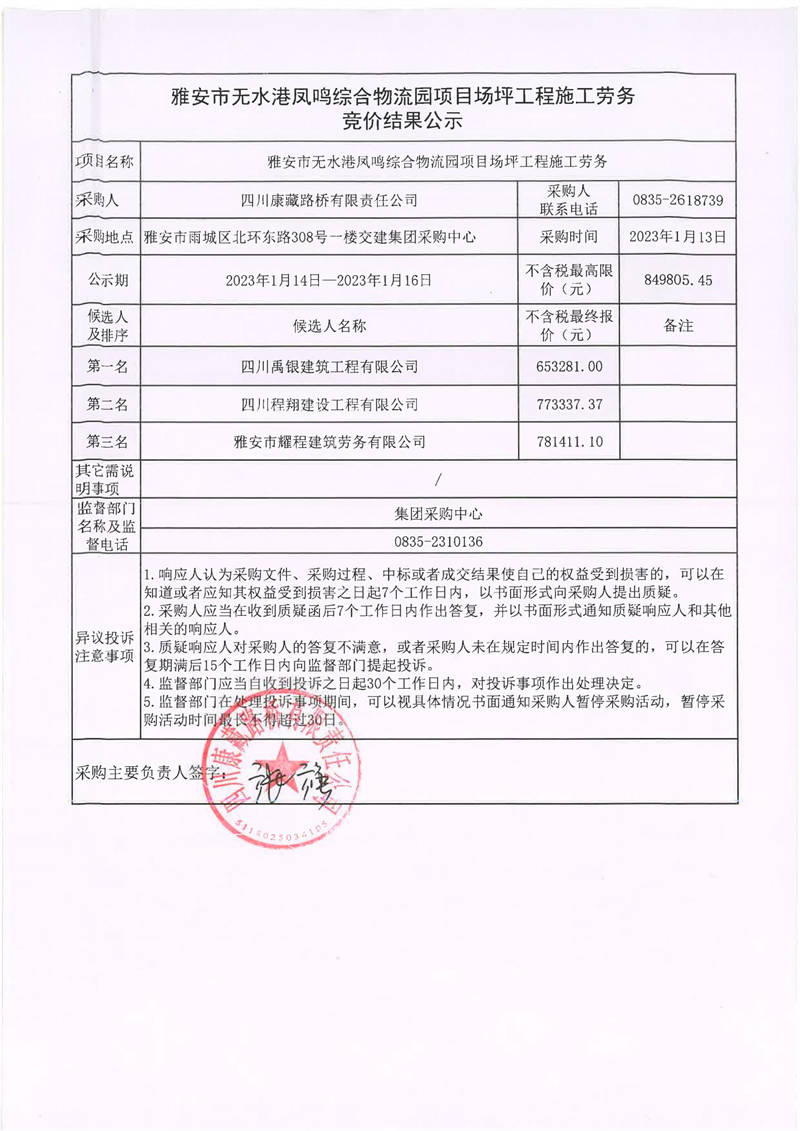 四川康藏路橋有限責任公司雅安市無水港鳳鳴綜合物流園項目場坪工程施工勞務(wù)競價結(jié)果公示