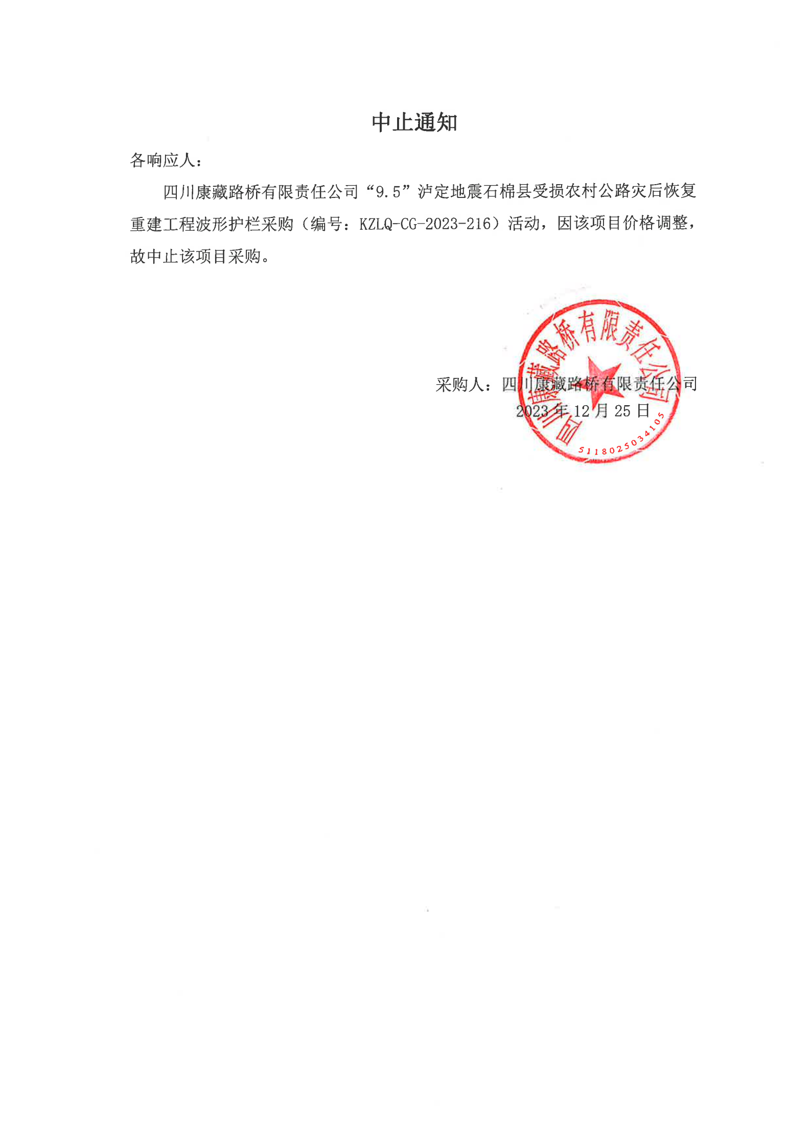 四川康藏路橋有限責(zé)任公司“9.5”瀘定地震石棉縣受損農(nóng)村公路災(zāi)后恢復(fù)重建工程波形護欄采購中止通知