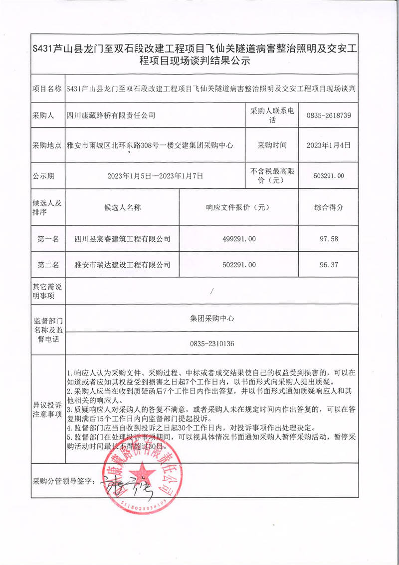 四川康藏路橋有限責(zé)任公司S431蘆山縣龍門至雙石段改建工程項(xiàng)目飛仙關(guān)隧道病害整治照明及交安工程項(xiàng)目現(xiàn)場(chǎng)談判結(jié)果公示