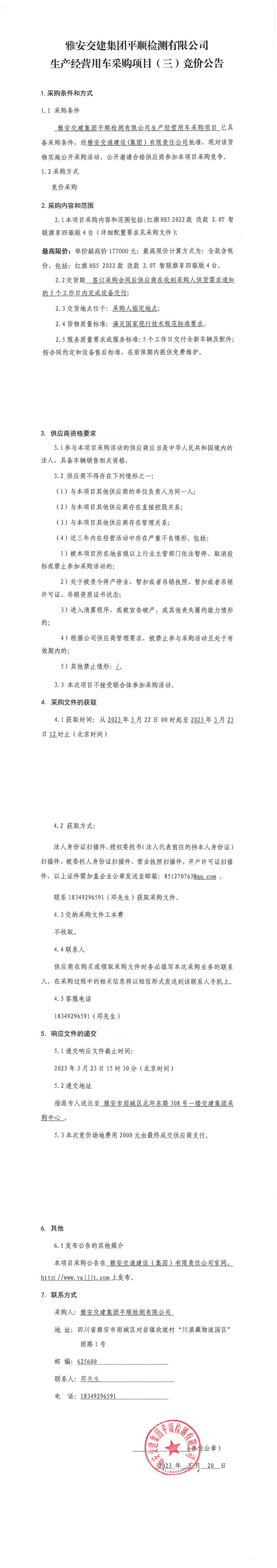 雅安交建集團(tuán)平順檢測(cè)有限公司平順公司生產(chǎn)經(jīng)營用車采購項(xiàng)目(三)競(jìng)價(jià)公告