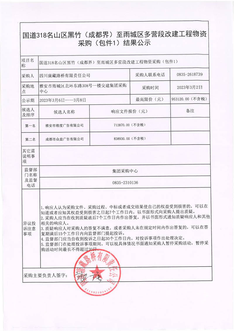 四川康藏路橋有限責(zé)任公司國(guó)道318名山區(qū)黑竹(成都界)至雨城區(qū)多營(yíng)段改建工程物資采購(包件1)結(jié)果公示